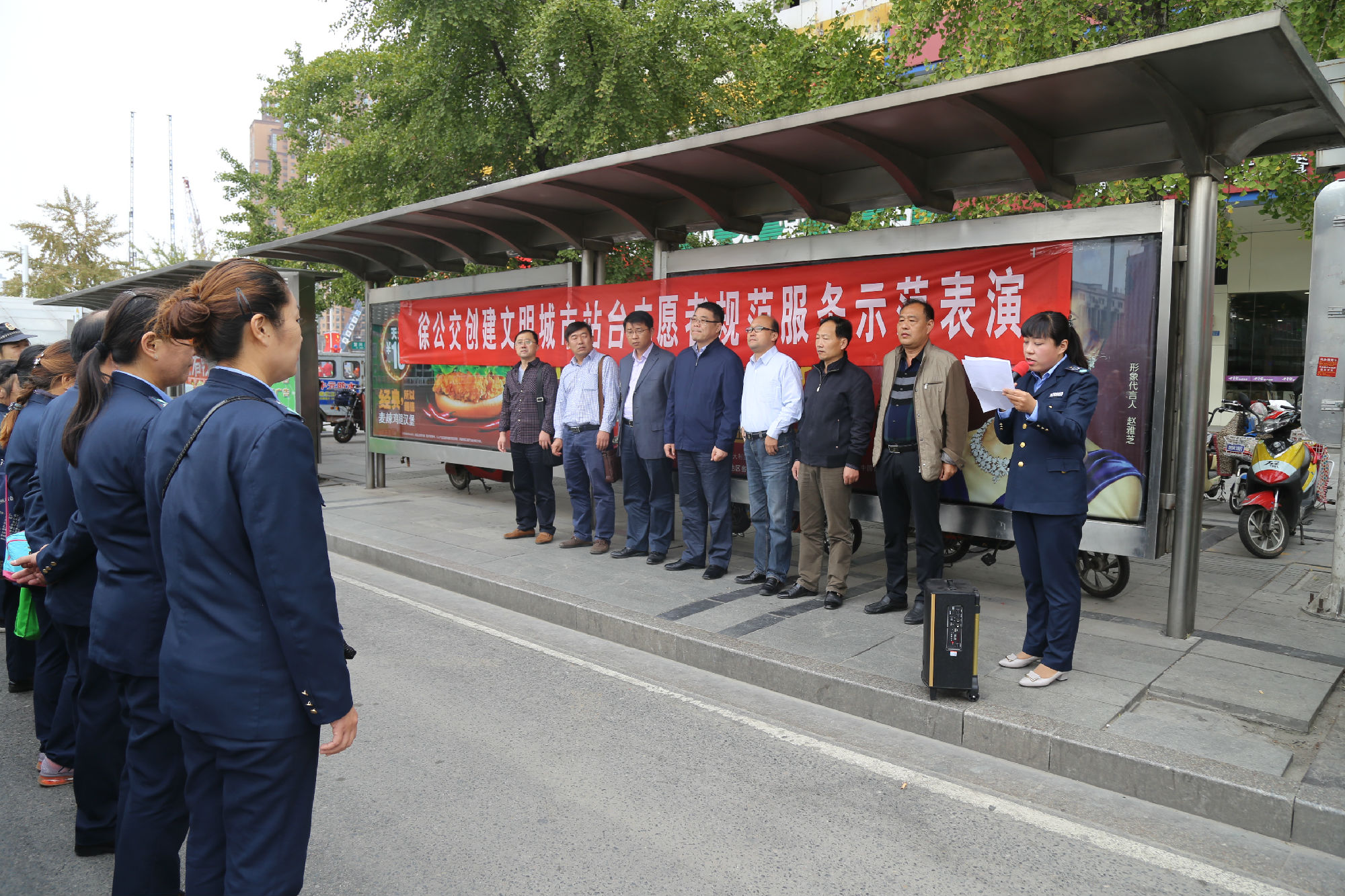 為進(jìn)一步規(guī)范站臺(tái)服務(wù)引導(dǎo)工作,不斷推動(dòng)文明城市創(chuàng)建順利進(jìn)行,10月9日上午,公司在徐州站主廣場(chǎng)舉行了一次公交站臺(tái)秩序規(guī)范服務(wù)示范表演。團(tuán)市委副書記夏友峰、運(yùn)管處客運(yùn)科科長(zhǎng)陳福升、以及市創(chuàng)建辦交通秩序二組三位領(lǐng)導(dǎo)蒞臨觀摩。服務(wù)督導(dǎo)隊(duì)34名站臺(tái)志愿者參加了示范表演。