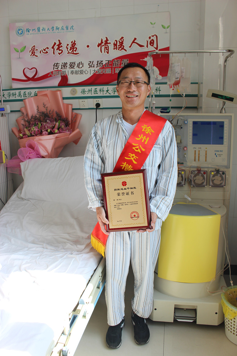 打過(guò)8針造血干細(xì)胞動(dòng)員劑,10月30日上午開始采集?!袄习郑佑?!”兒子在病床前給鄭剛鼓勁兒,雖然經(jīng)過(guò)了幾天動(dòng)員針的不適反應(yīng),此時(shí)鄭剛依舊很堅(jiān)定:“我比別人的打針反應(yīng)大,只要能救人一命,這都不算啥,我現(xiàn)在就希望孩子能盡快康復(fù)。”徐州市紅十字會(huì)副會(huì)長(zhǎng)李永衛(wèi)為鄭剛頒發(fā)了“捐獻(xiàn)造血干細(xì)胞榮譽(yù)證書”,為他點(diǎn)贊:“你是英雄!”患者家人在感謝信中寫道:“您這種高尚的壯舉給了我們?nèi)疑畹南M??!?/span>