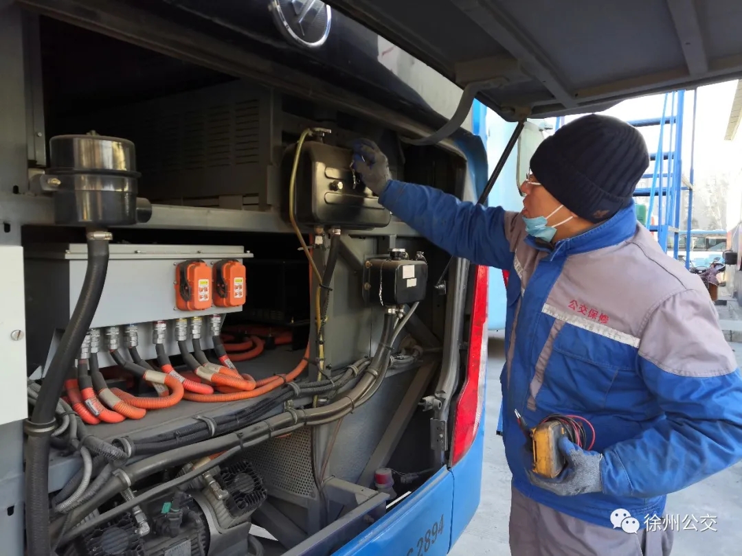 針對氣溫驟降,集團積極做好車輛機務(wù)保障工作,提前對柴油車輛及安裝燃油水暖加熱系統(tǒng)的純電動車輛更換低標號柴油,防止出現(xiàn)結(jié)臘現(xiàn)象;做好管路防凍工作,對車輛的氣路管路、儲氣筒徹底放氣、放水;為了預防車輪制動蹄片與制動鼓、輪胎與地面之間出現(xiàn)冰凍現(xiàn)象,各單位要求駕駛員在出車前提前開啟車載空調(diào)暖風設(shè)備,收車后做好車輛駐車停放工作。同時,在每個車場安排專人值守并做好修理人員、充電工的防寒保暖工作。
