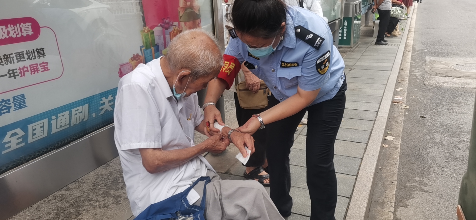8月2日上午8時(shí)許,公交督導(dǎo)員孫琪在朝陽(yáng)站開展站臺(tái)執(zhí)勤工作時(shí),突然聽到有人大喊:“快來(lái)救一下,有人摔倒了!”孫琪當(dāng)即上前查看情況,發(fā)現(xiàn)一位老人癱坐在站臺(tái)上,不停地喘著粗氣,胳膊上有一個(gè)大傷口,鮮血直流。