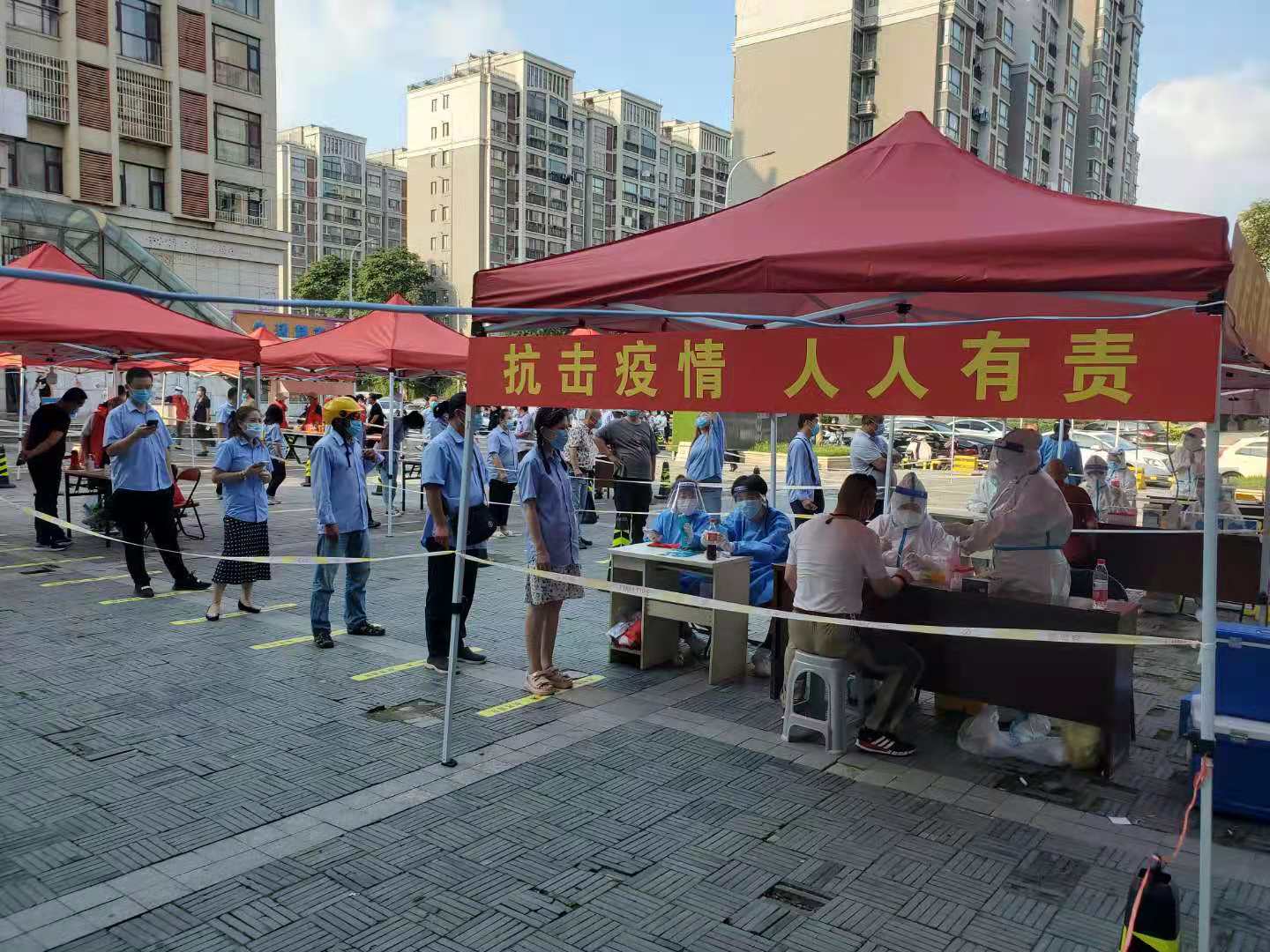 在銅山新區(qū)樵村社區(qū)檢測點(diǎn),新區(qū)公司指定專人現(xiàn)場維護(hù)秩序、登記信息、疏導(dǎo)人員,全方位抓緊、抓實(shí)、抓細(xì)每個(gè)環(huán)節(jié)。“請大家佩戴好口罩,保持間距。”“請大家排好隊(duì),提前拿出身份證,打開行程碼和健康碼……”檢測現(xiàn)場,工作人員不斷引導(dǎo)員工做好檢測前的準(zhǔn)備工作。