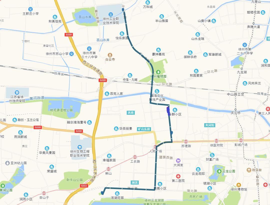 線路站點(diǎn):山南小鎮(zhèn),山水龍瑞,馬場湖路口,馬場湖,怡康花園,后勤學(xué)院北,誠坤鋼材市場,蘇堤北路立交橋(西),蘇堤北路立交橋(東),蘇堤路小學(xué),永業(yè)花園小區(qū),江蘇四監(jiān),銅沛路東口,中山北路立交橋