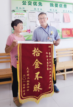 7月21日《都市晨報(bào)》A08版刊登了《急匆匆出門(mén)見(jiàn)朋友 3000多元現(xiàn)金遺失公交上》一文,講述了8路駕駛員潘要來(lái)拾金不昧的事跡。7月19日下午,家住銅山區(qū)大彭鎮(zhèn)的蔡女士從大彭鎮(zhèn)乘坐8路車到宣武,慌忙下車后,蔡女士忽然發(fā)現(xiàn)裝3000多元錢(qián)的布包不見(jiàn)了。兩人回憶,當(dāng)時(shí)忙著抱孩子了,把包遺失在了公交車上。蔡女士連忙回去,找到另外一名8路車駕駛員幫她聯(lián)系了8路調(diào)度室,很快傳來(lái)好消息:包找到了。原來(lái),蔡女士乘坐的8路車駕駛員潘要來(lái)看到了座位上有一個(gè)東西,當(dāng)時(shí)他誤認(rèn)為是坐墊,后來(lái),他看到有個(gè)乘客直接奔向那個(gè)座位,一屁股坐了下來(lái),神色有些慌張。潘師傅從后視鏡看到,那個(gè)東西鼓鼓囊囊不像坐墊,便走了過(guò)去,將包拿回駕駛室。