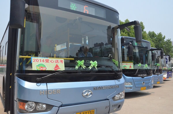 一年一度的高考是社會(huì)關(guān)注的熱點(diǎn),每年這個(gè)時(shí)候,徐州的大街小巷都有這樣一個(gè)群體——送考愛(ài)心車(chē)隊(duì)。懸掛綠絲帶的送考車(chē),成為城市道路上靚麗的風(fēng)景。今年,公司也加入到“愛(ài)心送考,算我一個(gè)”2014愛(ài)心送考公益活動(dòng)中,在66路、76路、65路、11路、608路等5條途經(jīng)考點(diǎn)的線路成立“愛(ài)心公交”送考專線。高考期間,考生憑準(zhǔn)考證可免費(fèi)乘坐這5條線路。為了給考生提供力所能及的幫助,駕駛員還在車(chē)上配備了方便袋、清涼油、創(chuàng)可貼等用品,以備乘客不時(shí)之需。圖為“愛(ài)心送考”啟動(dòng)儀式現(xiàn)場(chǎng)。